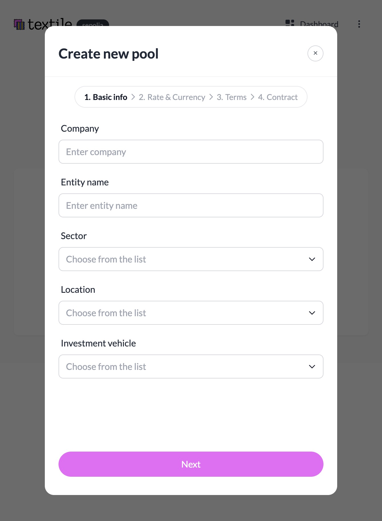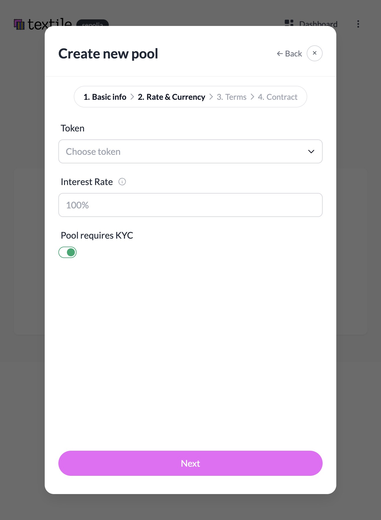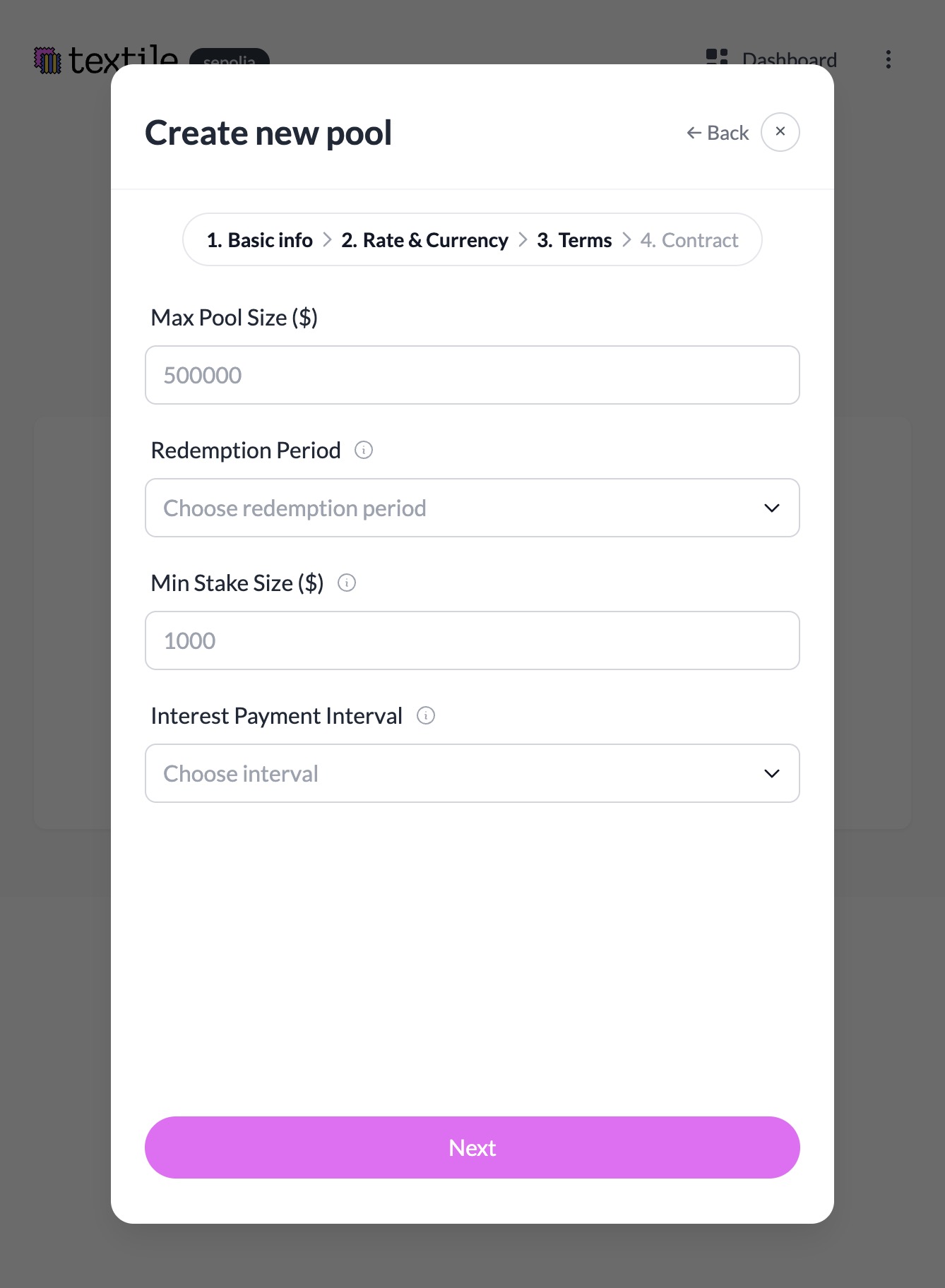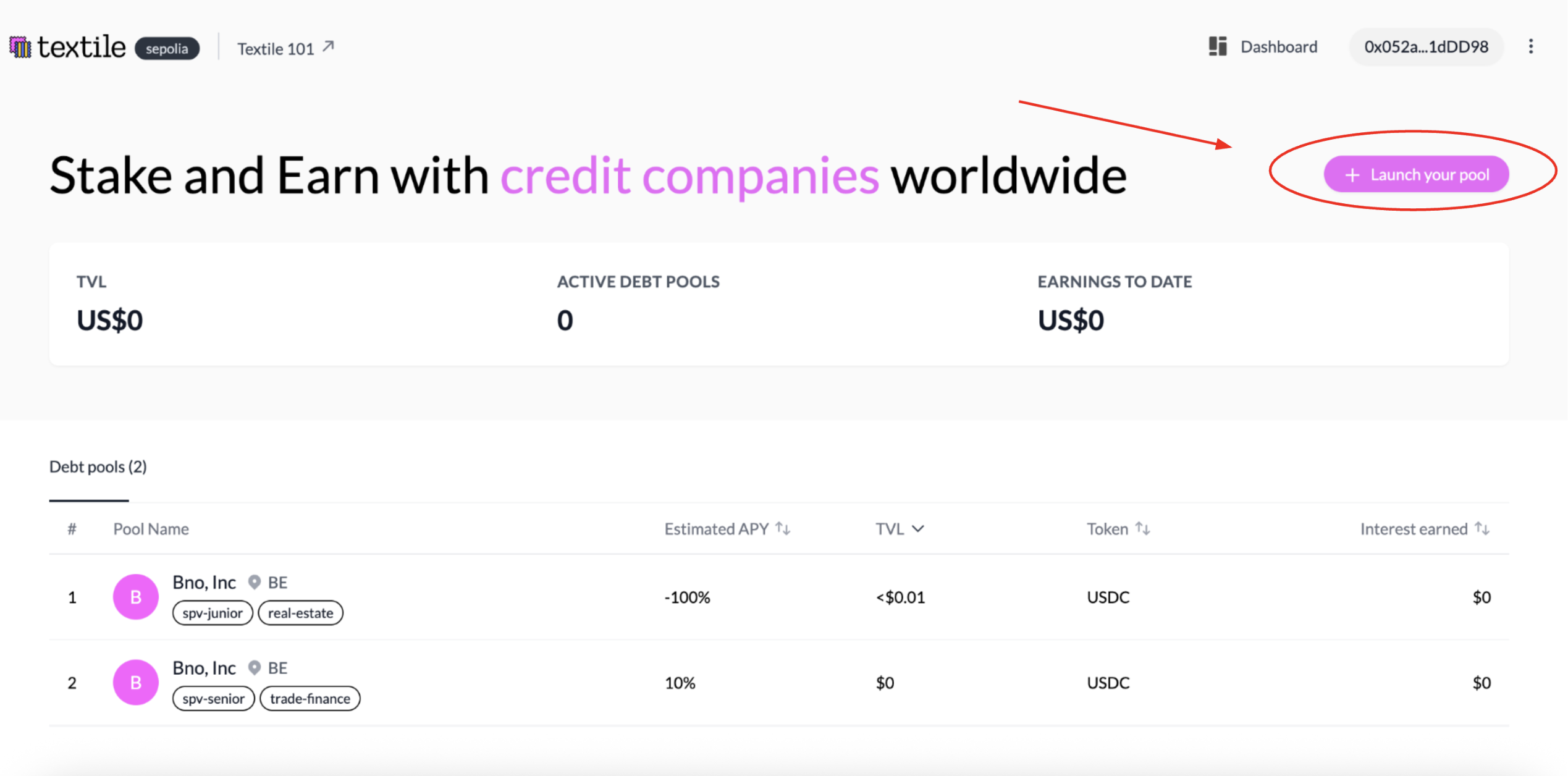 Click “Open a Credit Line” or "Launch your pool" and fill in the following: