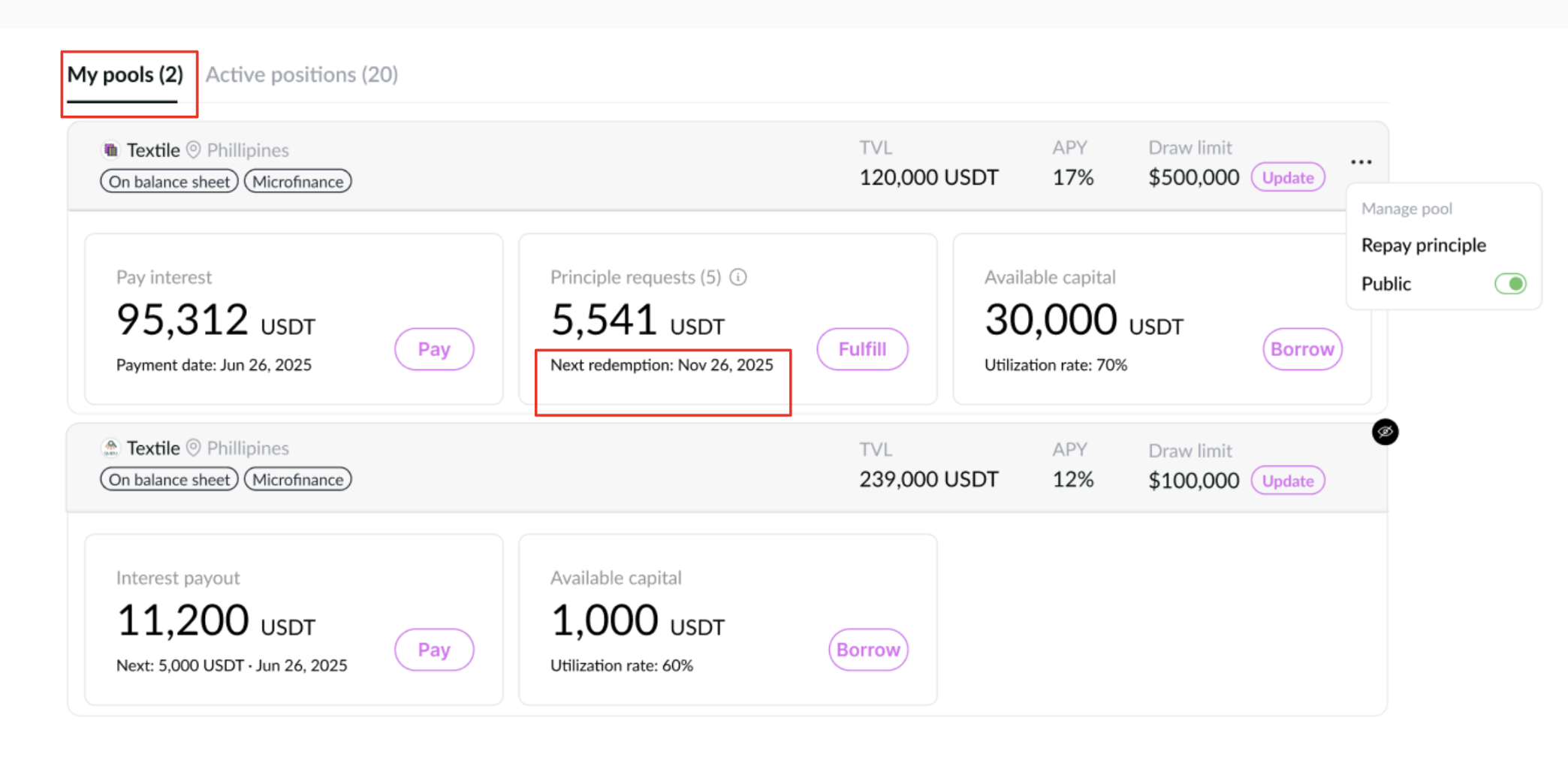 Principal fulfillment can be done either from the wallet or from the capital available in the pool.