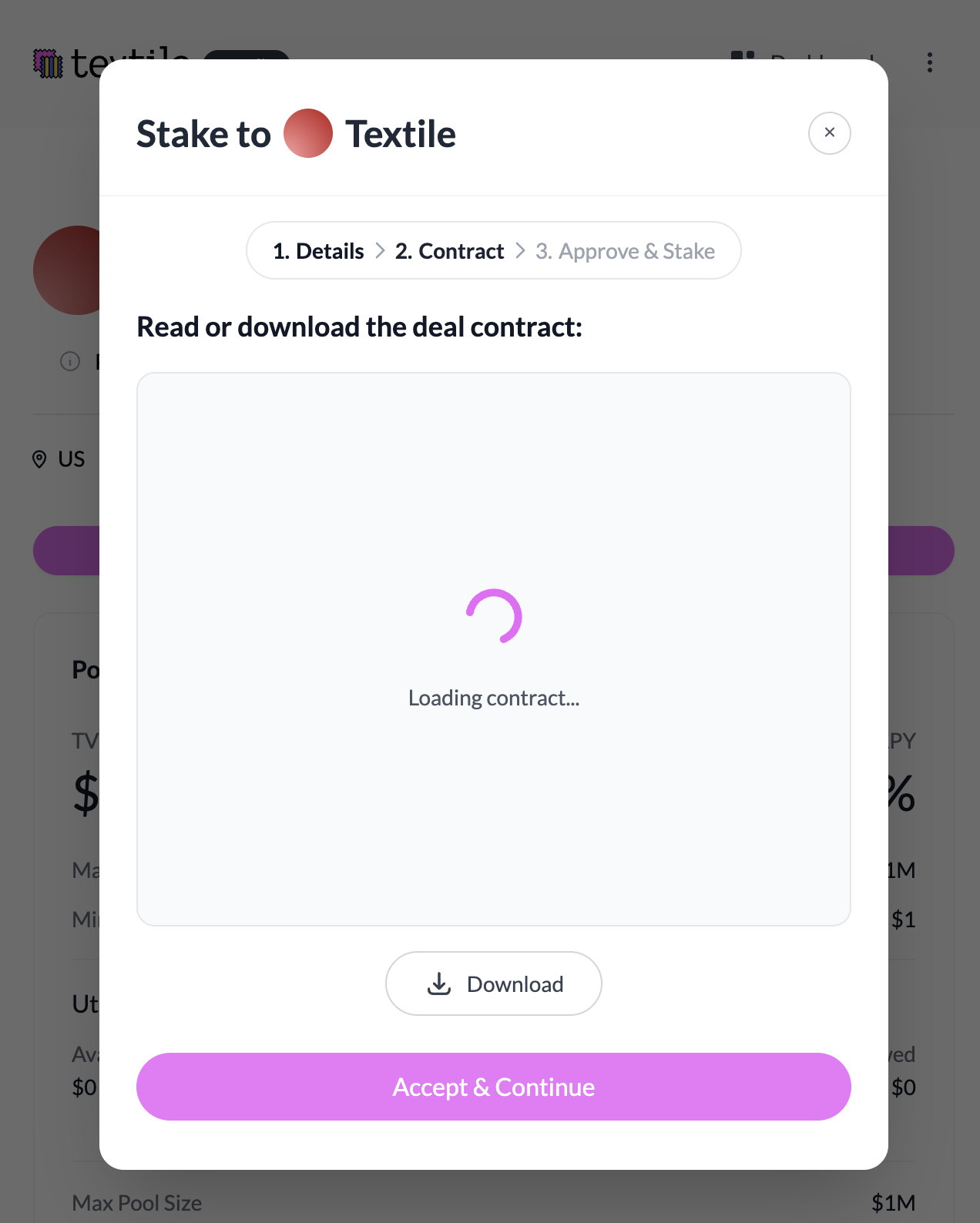 Navigate to the pool you want to stake into. You will see the pool’s details, terms, legal contract, and available liquidity.