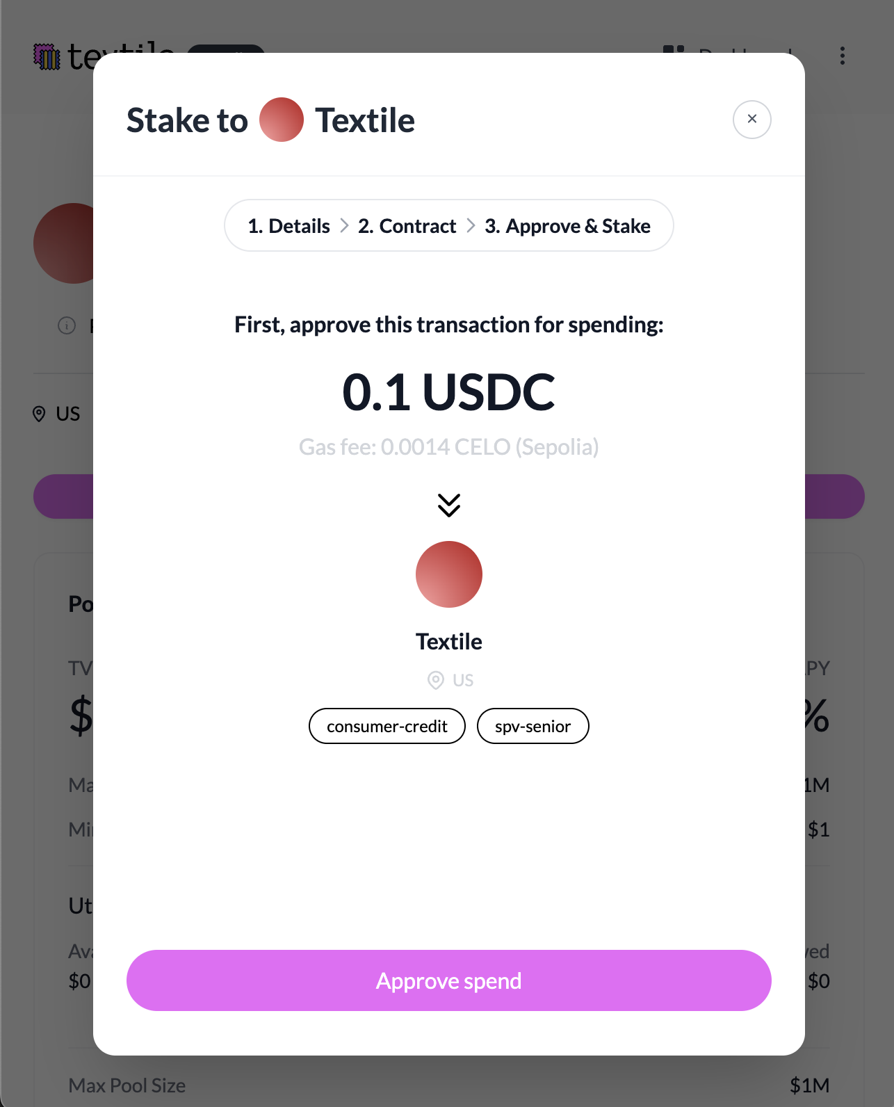 Staking capital allows you to become a lender in a borrower’s credit pool and earn interest. Follow these steps to deposit funds and receive Debt Tokens.